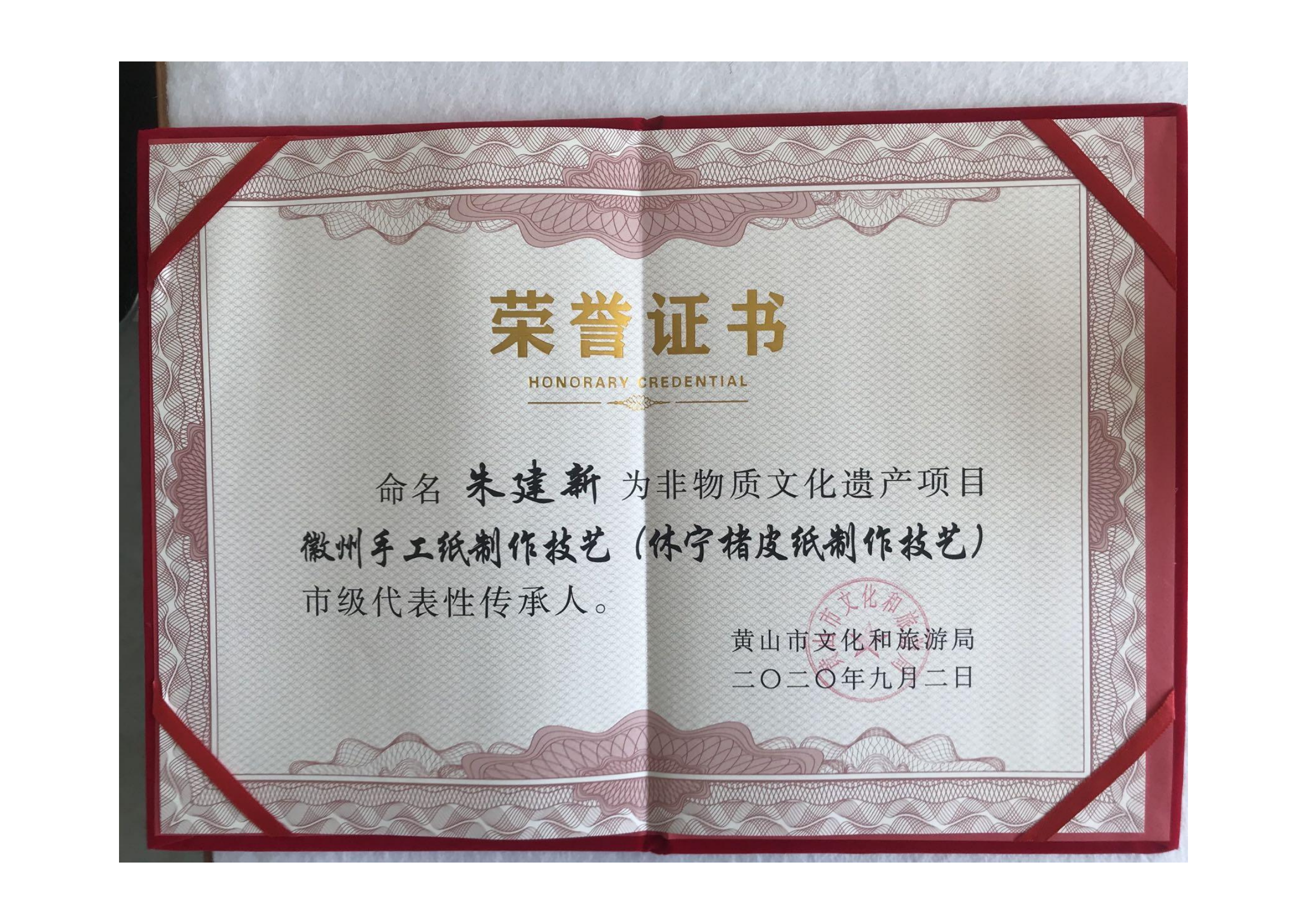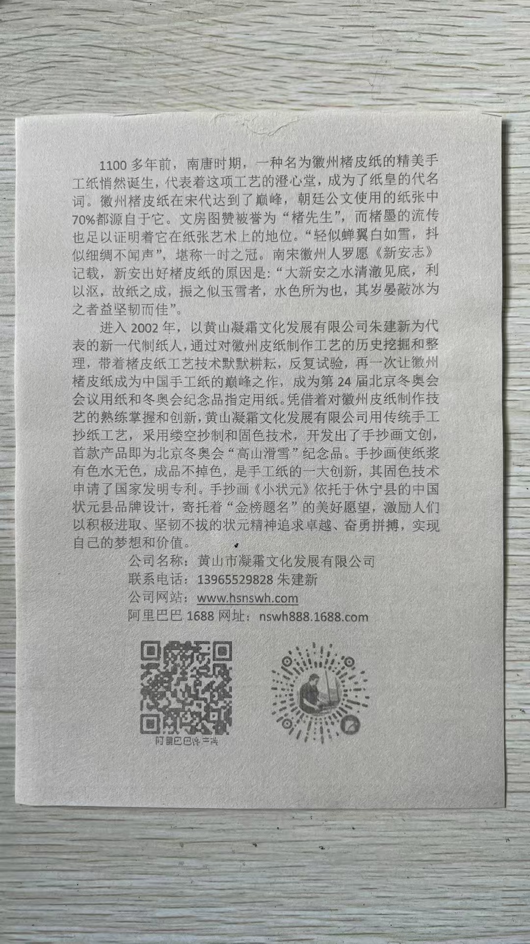 2020年公司實現了文化類規(guī)上企業(yè),迄今已申請了15項發(fā)明專利,19項實用新型專利,其中已授權發(fā)明專利3項,實用新型專利11項;2022年,公司為北京第24屆冬季奧運會提供楮皮紙和紀念品,非遺傳承人朱建新被授予北京2022年冬季奧會參與證書,以感謝第24屆冬奧會取得圓滿成功做出的貢獻。2022年-2024年,朱建新被中國科技大學聘為《中國筆墨紙硯》全校公選課特聘導師;2023年,朱建新獲省級非遺傳承人稱號、“黃山工匠”稱號。